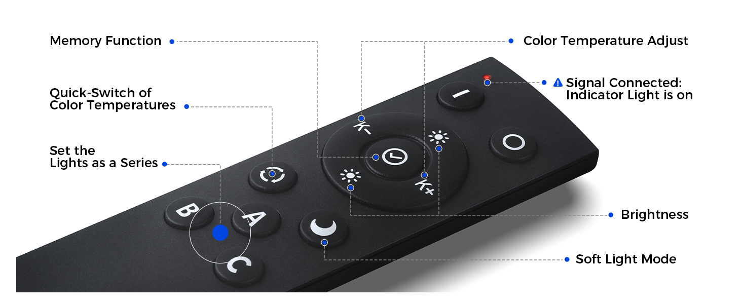 Operate your commercial office lights with ease using a multifunctional remote. Organize lights into groups (A, B, C) and adjust the color temperature from 3000K to 6000K with brightness from 5% to 100% to customize your lighting experience. Night mode provides 5% brightness at 4000K. The quick memory function saves settings with a 5‑second press and automatically restores them for your next use, delivering a seamless lighting. experience
